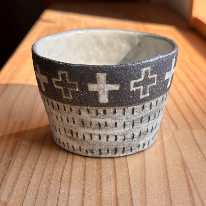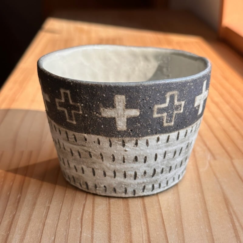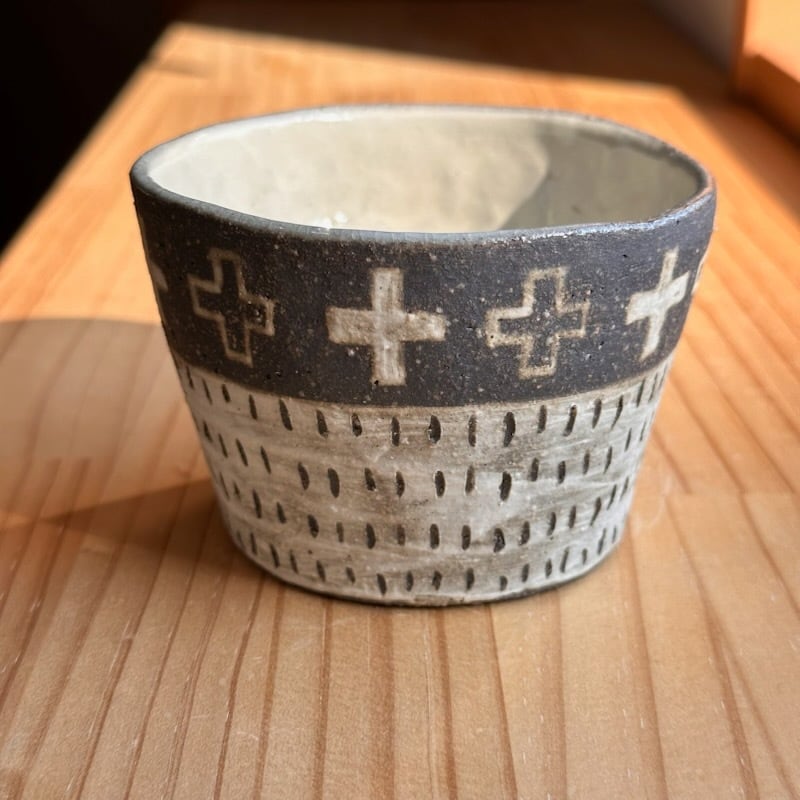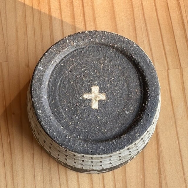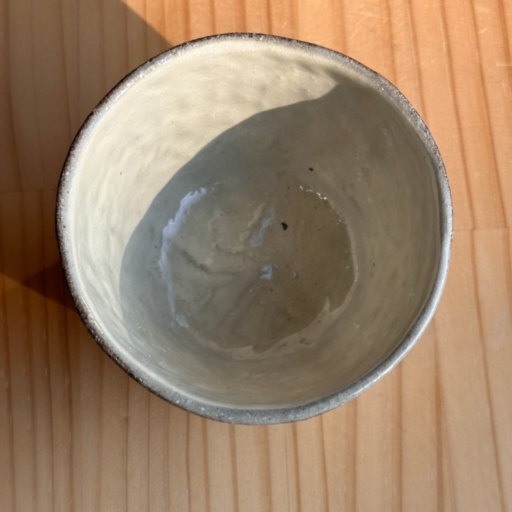 ・ザラッとした感じ(白、茶系、黒系の部分も)の箇所は化粧土を刷毛で塗っています。油染みには弱いため、ご使用になる前に水で一度洗ってから使っていただくか、お皿等は一枚ペーパーなどをひいてからお使いください。