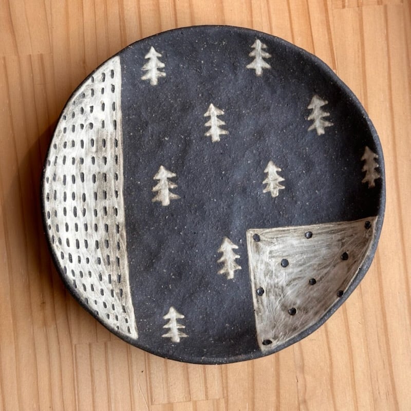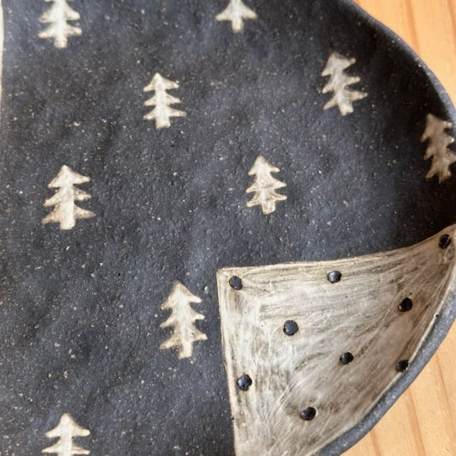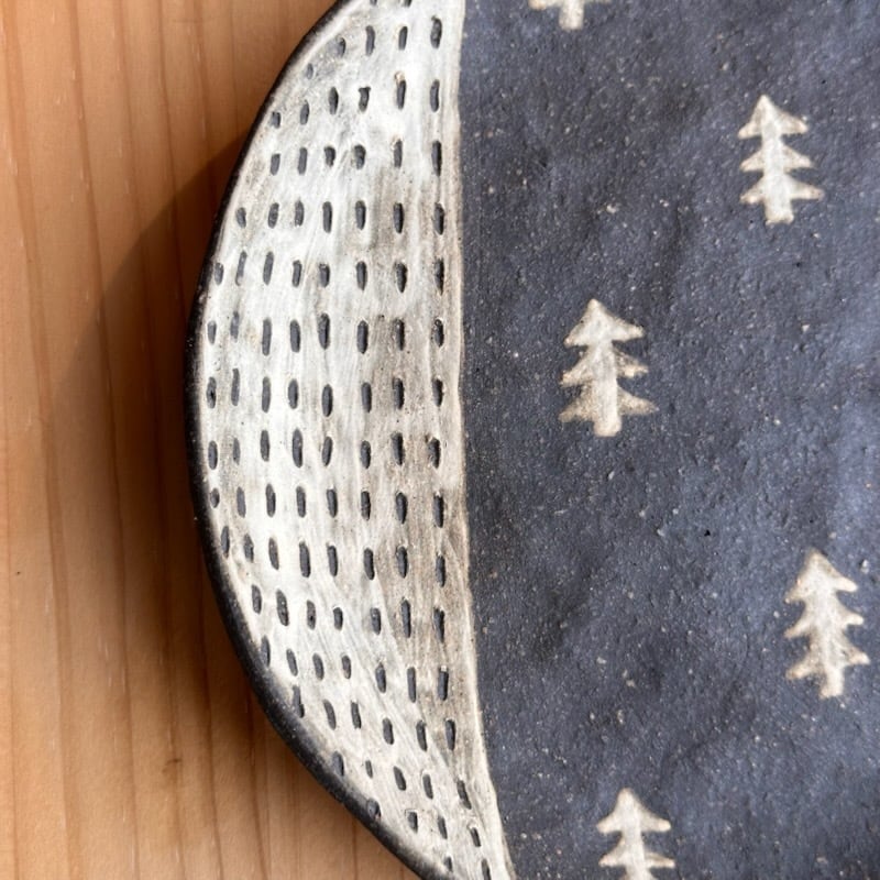 ・ザラッとした感じ(白、茶系、黒系の部分も)の箇所は化粧土を刷毛で塗っています。油染みには弱いため、ご使用になる前に水で一度洗ってから使っていただくか、お皿等は一枚ペーパーなどをひいてからお使いください。